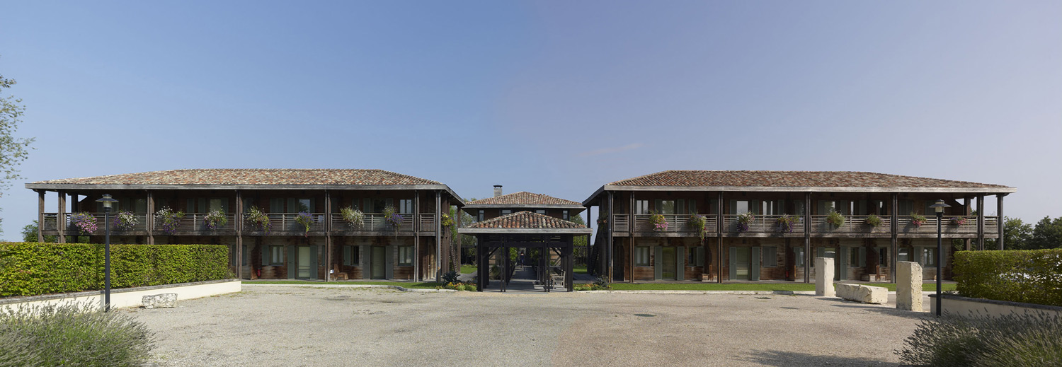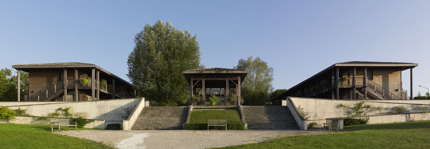 The project, named « maisons des vignes » (vineyard houses), is organized around a square plan house which includes a welcome-boutique area at the intermediate level, a tea-room at the upper level, and mecanical rooms and a fountain located on the lower level. The central building is linked to four dwelling structures via a wood pergola: 2 main structures with 8 studios each in the upper part of the site, 2 structures containing 12 studios each located 3 meters below. The 40 studios all have at least a double orientation. The formal vocabulary of the architecture is inspired by the local traditional architecture of Saintonge (long and low houses). The use of Douglas fir in the treatment of the facades and exterior circulation areas helps create a harmonious relationship with the immediate woods surrounding the buildings, and has an exotic appeal for the users who spend an average of three weeks of spa treatment in this area far from their usual surroundings. The basins, which are located along the longitudinal axis, help to create a space dedicated to rest and serenity.
