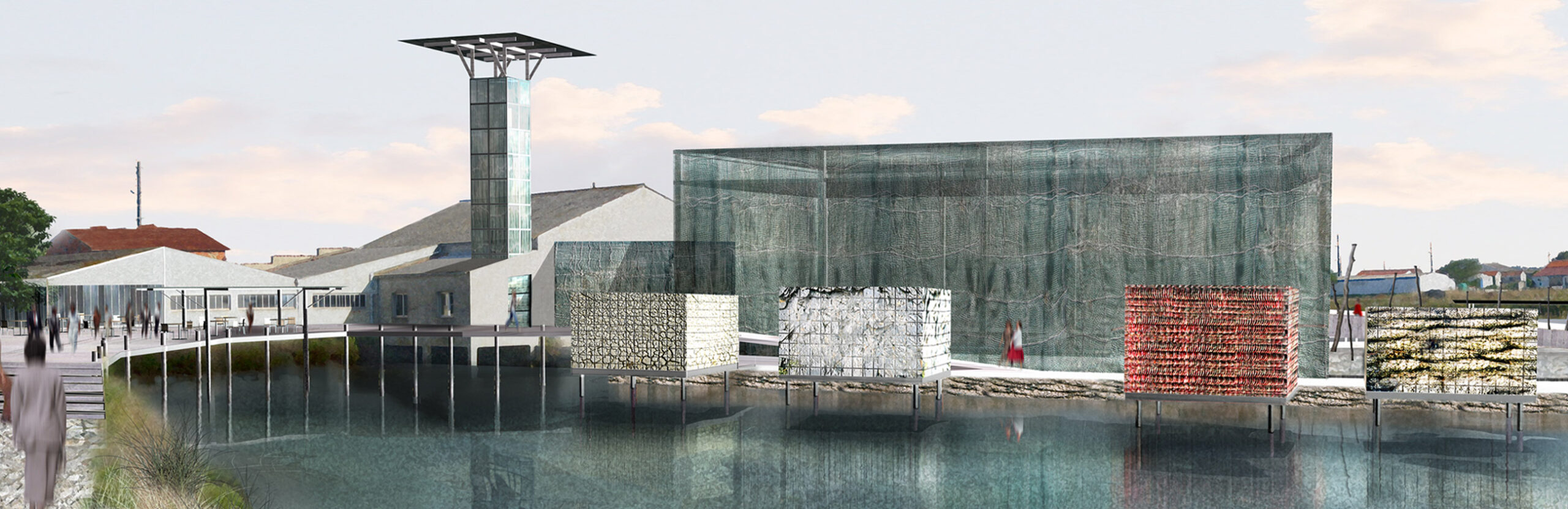 This project is set in an exceptional site. The basin of Marennes-Oléron is a vast marsh where the culture of oysters traditionally takes place. The landscape is made of basins also called “les claires” which are placed side by side and separated by narrow paths where the oyster farmers’ shelters are placed. The competition focuses on the development of a multi-site tourist attraction set on the Cayenne axis which extends about 2 km along the channel of the Cayenne, inviting the visitor to stroll from the Marennes town to the Cayenne harbor.