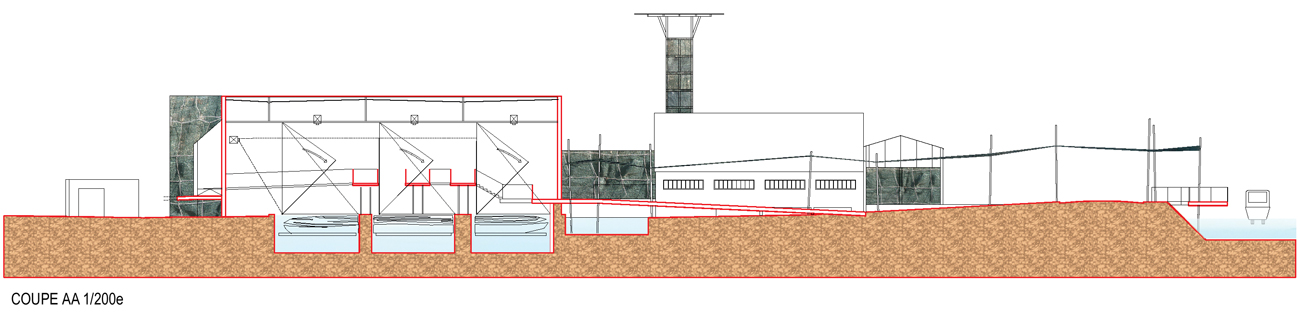 We wanted to develop a contemporary project coherent with the past and the context in which it has to be integrated. All of the existing buildings have been preserved, renovated and modernized. The new construction and the additions have been designed with the visual, tactile and sensorial experiences inherent to the site in mind. The project revisits the materials and colors linked to oyster farming – slate, brick, plastic captors, fishing nets, salt piles, etc… – which are distributed throughout the site.